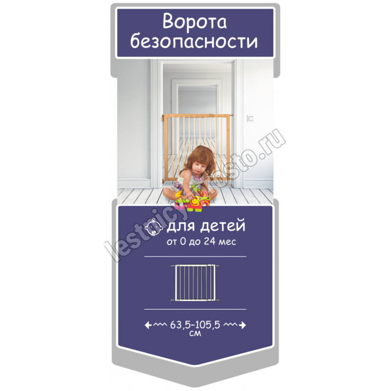 Изделие имеет раздвижную конструкцию с большим диапазоном - от 63.5 до 105 см и может быть установлено в любые дверные или лестничные проемы,  в качестве основного материала используется натуральное дерево (бук) с высококачественной  шлифовкой.