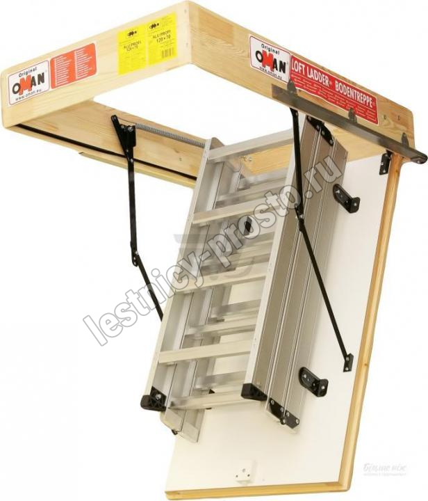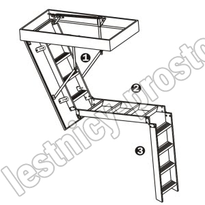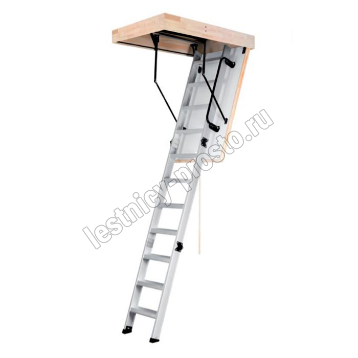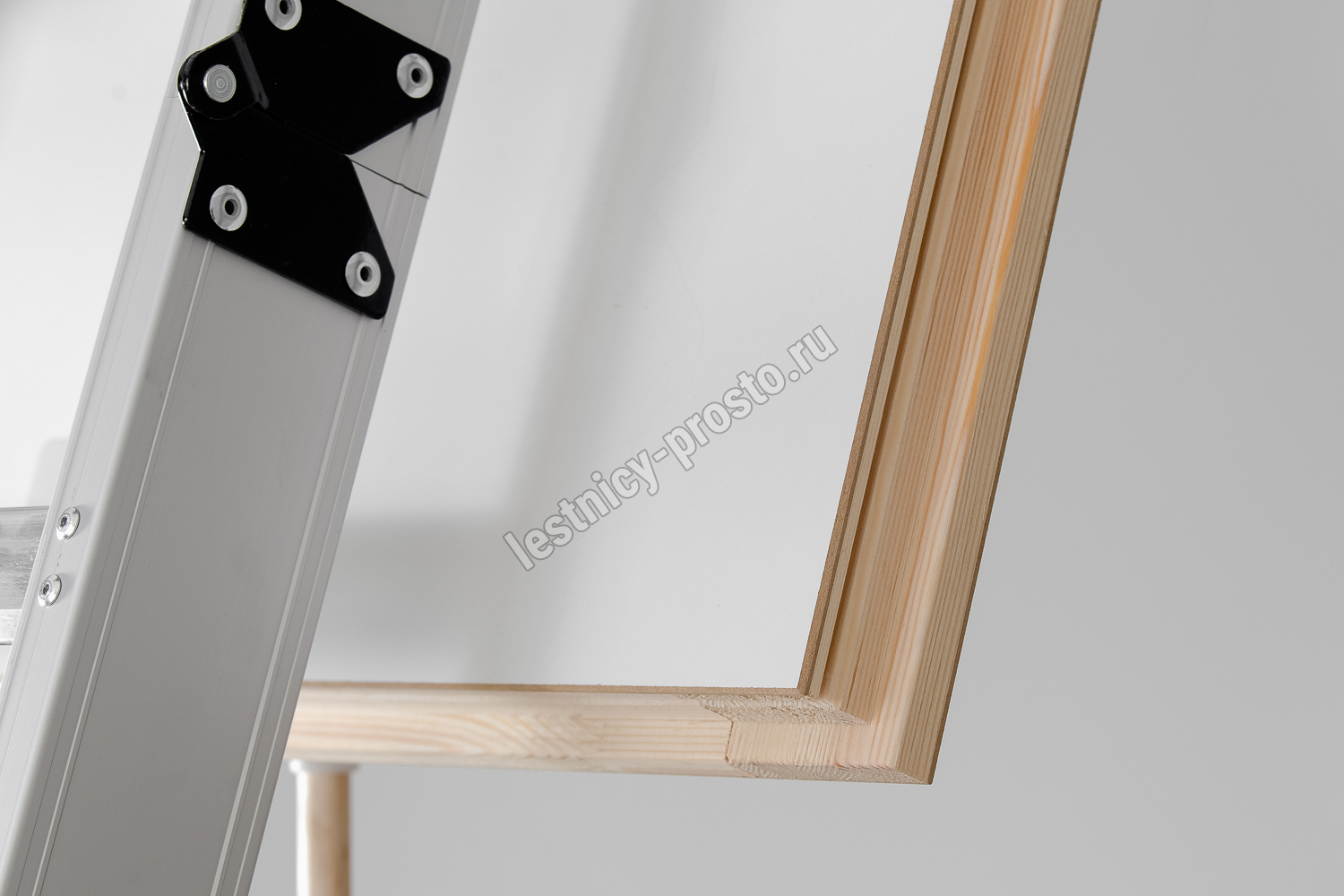 Складная 4-х секционная чердачная лестница. Рабочая поверхность полностью выполнена из алюминия. Термоизоляционная крышка типа "сэндвич" имеет усиленную теплозащиту, облицована с двух сторон ДВП белого цвета.