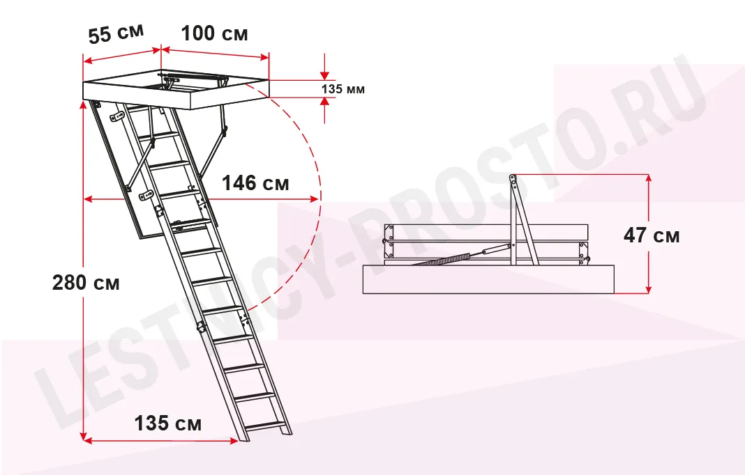 Лестница складная четырехсекционная, изготовлена из массива сосны. Термоизоляционная крышка типа "сэндвич" утеплена пенопластом толщиной 20 мм, облицована с двух сторон ДСП белого цвета.