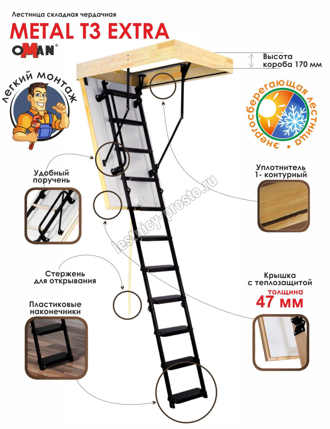 Лестница складная трехсекционная. Рабочая поверхность полностью выполнена из металла и покрашена порошковой краской. Термоизоляционная крышка типа "сэндвич", толщиной 47 мм, утеплена пенопластом, облицована с двух сторон ДCП белого цвета.