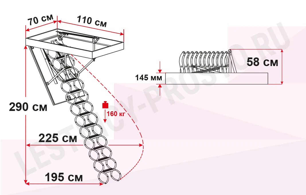 Все элементы лестницы выполнены из экологически чистых материалов и обработаны веществами, не содержащими тяжелых металлов. На ступенях антискользящие насечки. Короб лестницы изготовлен из металла. Термоизоляционная крышка типа "сэндвич" утеплена пенопластом, облицована с двух сторон ДСП белого цвета. Короб люка с уплотнителем. В комплекте деревянный стержень для открывания лестницы.