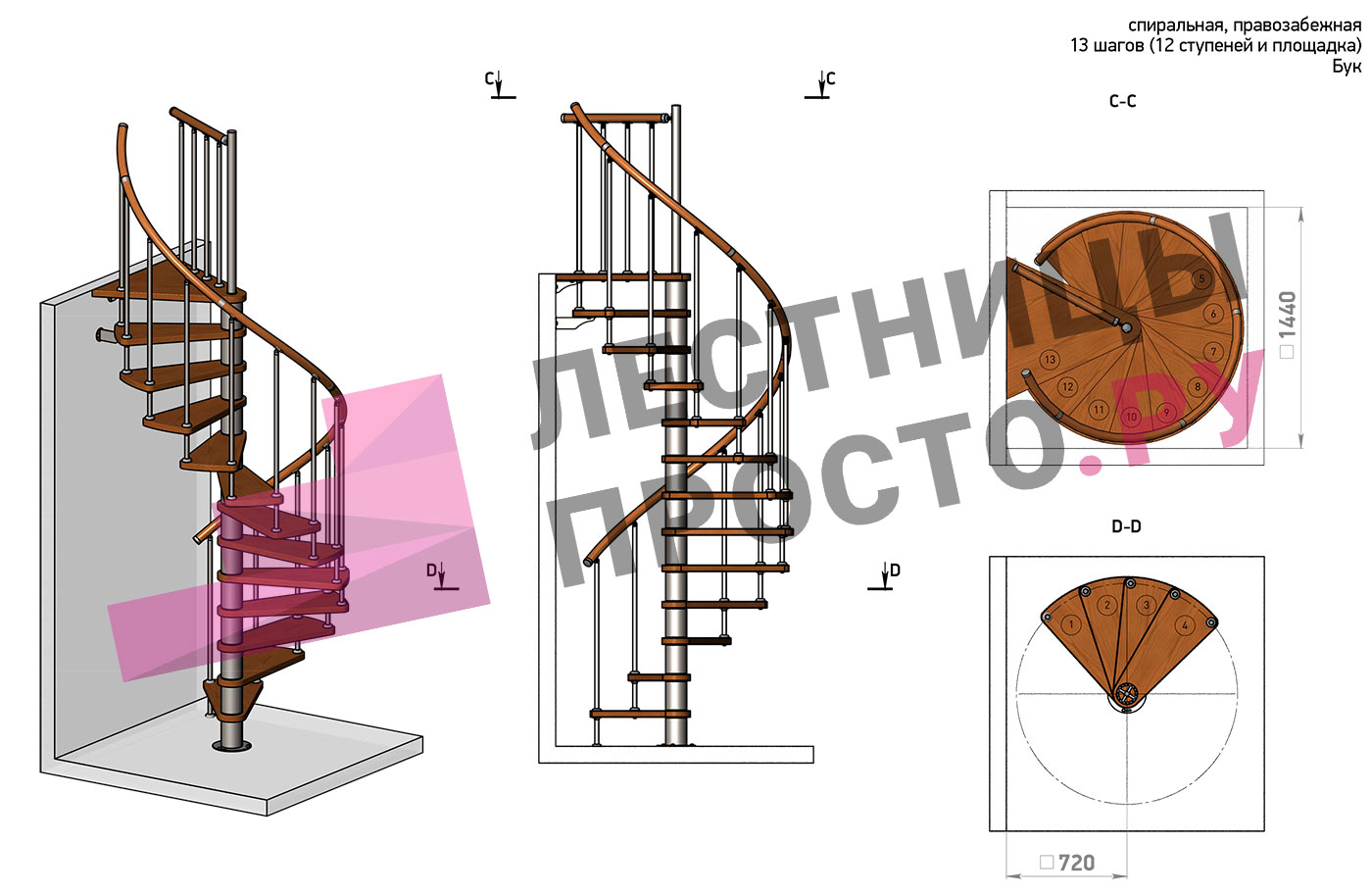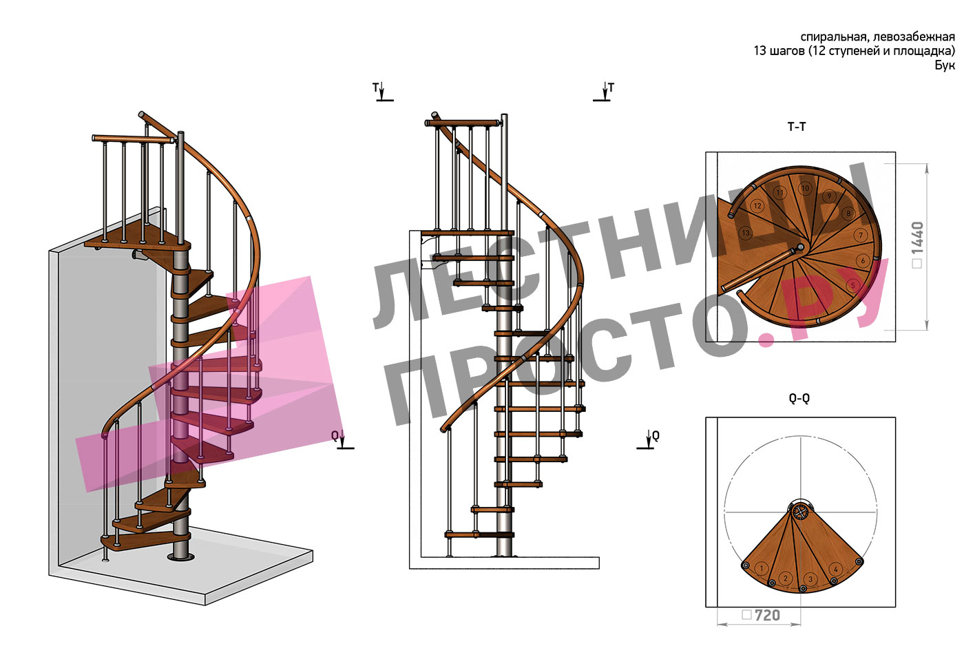 Винтовая лестница Prosto Spiral Black D140см, h282.2-326,3 см, бук